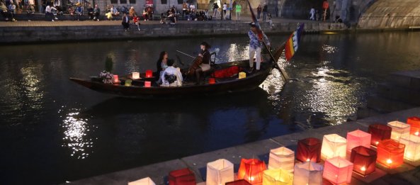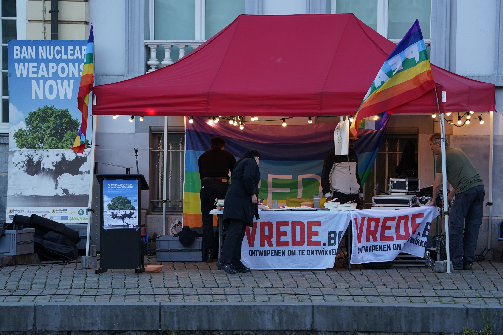 Een brede coalitie van Belgische vredesorganisaties sloeg de handen in elkaar om een getuigenis mogelijk te maken van de twee hibakusha, Japanse overlevenden van de atoombommen op Hiroshima en Nagasaki, aan boord van de Peace Boat. Vrede vzw, Pax Christi Vlaanderen, de Leuvense Vredesbeweging, Soka Gakkai International Belgium, het Brugse Vredesplatform en het Vredesoverleg Gent bundelden hun krachten voor dit initiatief. Ze organiseerden een pers- en publieksmoment, gemodereerd door Bastien Willemot (Vrede vzw) en omlijst door de ingetogen klanken van het vredeskoor Brio. Ook de burgemeester van Brugge, Dirk De fauw, gaf een toespraak. Als lid van ‘Mayors for Peace‘ riep hij op tot een wereld zonder kernwapens en tot de implementatie van het VN-verdrag. Namens de ambassade van Japan tekende Izumi Fuji present, het hoofd van de afdeling Informatie en Cultuur.