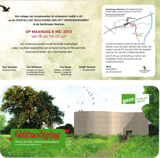 Het heeft lang geduurd, maar eindelijk zal het Vredesmonument in de Gentbrugse Meersen ingehuldigd worden. Dit gebeurt op 6 mei 2013 om18u.